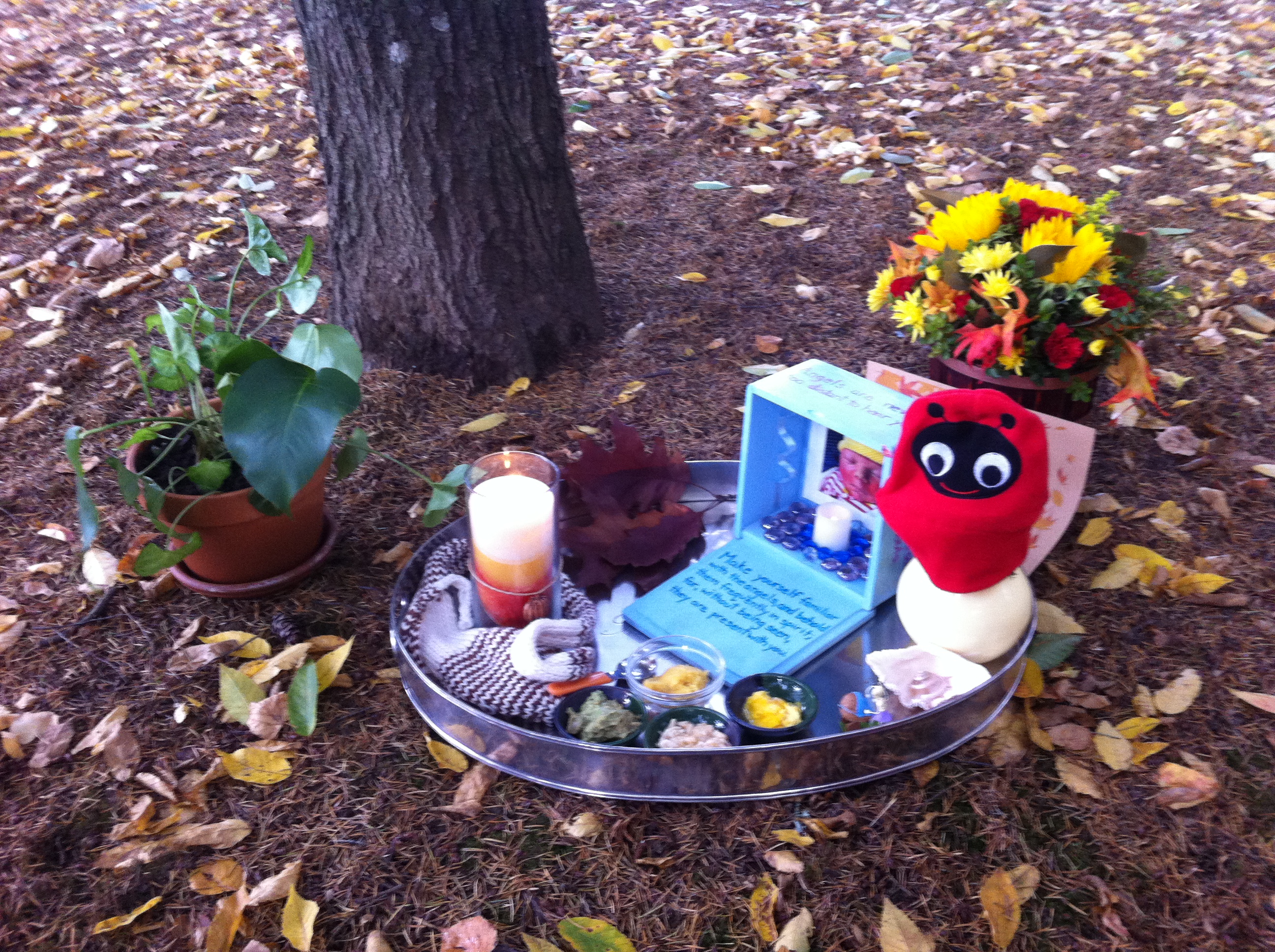 There is this huge world of people out there who love you and I wanted to invite them all. But instead I invited those who were with you when you were here: your aunts and uncles, your midwives. Your uncles couldn’t come, nor your midwives so it was me and Daddy and Vesta and Jenn and Larissa, K and M, not far away. Michael brought you a beautiful, autumnal bouquet in the morning and got me out of bed and out of my head. Perfect because I forgot to have Daddy get flowers. Jenn spent her afternoon thinking about you while making us a huge pot of soup. She brought the snake she’s been knitting, so you have one just like your sisters. She offered a ladybug hat, too small for M but perfect for you, just like the one that you wore when you were here, that M wore when she was small. Larissa planted a mother and a baby house plant together for us and dug deep into her childhood seashell collection for a shell with arms (all of us) cradling a perfect spiral (you). Daddy bought me donuts and cider that taste like home. Vesta and I made muffins. I prepared some foods for you in little dishes with a little spoon: squash (from Tamara), guacamole Vesta made, banana, soft boiled yolk. I couldn’t do it myself so Jenn poured your milk into a vase and we arranged a tray. I brought your box from Natalie and a lighter for the candle Daddy bought special.