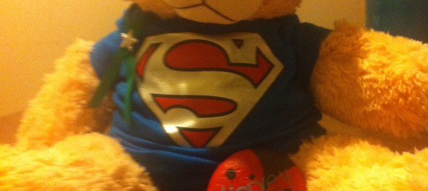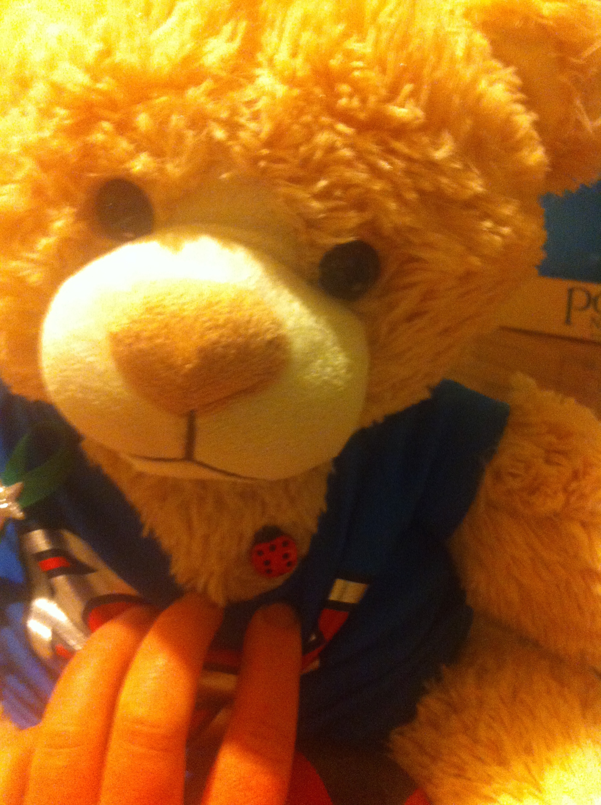 I couldn’t put him down. I could only angle him away from my body to see the Super Man onesie he was carefully and lovingly dressed in by some stranger, some beautiful, compassionate stranger who made and dressed this bear and thought about Harvey, my Harvey, my son, who she never knew, who she never will. I ran my fingers down his chest, feeling the crinkly smoothness of the infamous “S” symbol. My finger stumbled over a hard bump underneath and I ran them over it again. Again the bump. I pulled the neck of his shirt down to reveal a tiny ladybug button sewed right where his teddy bear heart is, or would be. They wrote me an email, asking me his detail, nearly a year after I ordered my bear and paid a measly $25 to cover barely the shipping for my most cherished possession. I told them his story: that we think of him as a hero for saving the lives of other babies through organ donation, that we think of him when we see ladybugs, that anyway they decorate him, with or without these things, we will be so grateful. And here he is, in my arms, with both. And I cannot put him down. I squeeze and gently squeeze his weighted arms and legs. I clutch him closer to my chest. I hold him up in front of me to examine him, to see the expression on his face, the paw prints on his feet, how his brown, little, button eyes have just the slightest imperfection in the body of the right one. I bend him forward to look at the size of the onesie, he is a big bear and I wonder the size. Newborn. Of course. I hold him again and I cry into his softness. And I remember, oh! how my body remember this exact weight, laid across my lap, my arm going numb from the weight of his head and my inability to shift him because of the monitoring equipment, the life support machines, tethering him just inches from his cold, NICU bassinet. I could not move my baby, nor did I want to. I would hold him until my arm fell off from the weight of him.